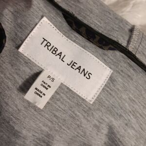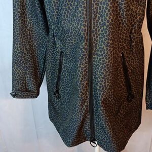 This green and black leopard print hooded Tribal Jeans women's rain jacket is a size Small with a pit to pit measuring 19.5" and a length of 30". Two front zippered pockets. In excellent condition.
