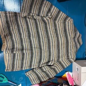 Chic sweater with a button-up front. Features a mix of black, tan, and blue stripes.
