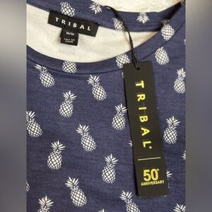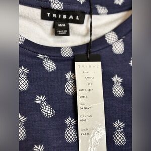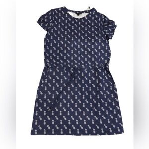 Chic navy blue dress with playful pineapple print. Short sleeves and a tie waist for a flattering fit. Perfect for casual outings.