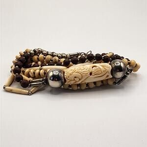 Bold and extraordinary vintage statement necklace from the late 1960s–1970s. This 30" four-strand piece combines dark wood, silver-tone metal, and bovine bone beads, including traditional hairpipe shapes. The dramatic focal point is a hand-carved bone accent featuring a lion attacking an elephant — a powerful and rare motif. Finished with a secure hook-and-eye clasp. A true conversation starter, perfect for collectors of global, boho, and retro statement jewelry. Clean pre-loved condition with age-appropriate wear.