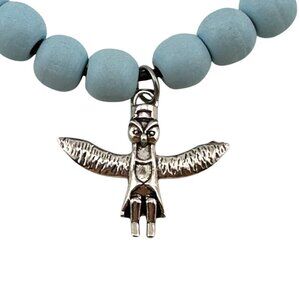 HANDCRAFTED -- antique silver-plated tribal owl totem, surronded by aqua colored wooden beads, hangs from a black vegan leather cord necklace with silver-plated lobster claw and extender. Southwestern style. The necklace is 17 1/2" long with a 2" extender.The tribal owl totem is about 1 1/4" from cord to bottom. Hand crafted in my home studio. Brand new, never worn. Unisex. Great for gift giving.