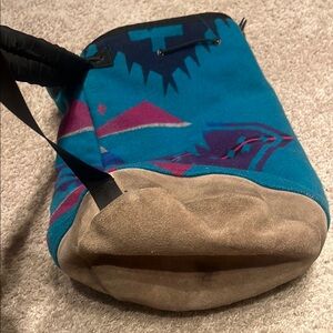 Stylish tribal design. Vibrant colors. Drawstring cinch and sling. Bag is 100% wool on the outer part, nylon on the under part and leather on the bottom. Used but good condition.