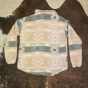 Stylish button-up shirt with tribal patterns. Features front pockets and black buttons. Perfect for casual wear.