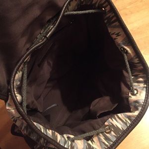 Super cute tribal pattern backpack! The design has pink, gray, brown, and white details. There are 4 outer pockets, and a zipper and open pocket on the inside! It can be closed with a drawstring and a buckle too!