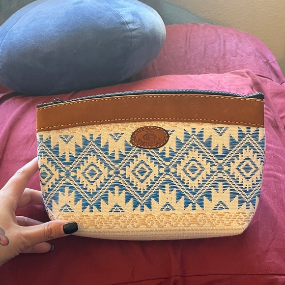Stylish clutch featuring a tribal pattern in blue and tan. Perfect for adding a touch of elegance to any outfit.