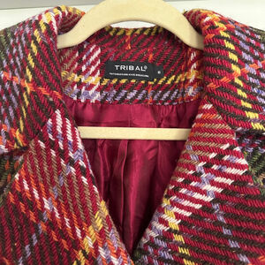 This pre-owned Tribal brand coat features a multi-colored plaid pattern in shades of red, green, yellow, purple, and brown. The coat has a notched lapel, a button-front closure with four visible buttons, and a satin-like red lining. The exterior is composed of 45% nylon, 35% wool, and 20% rayon, with a 100% rayon lining. The coat is labeled as size 8 and was made in Bulgaria. A spare button is attached to an interior tag. The coat measures approximately 34 inches from the shoulder to the hem.