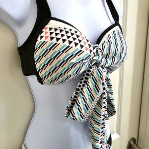 This tribal print bikini set features a bold stripe & geometric pattern, thick adjustable straps, and a large front tie that can be styled two ways—wrapped to the back or tied in front.
