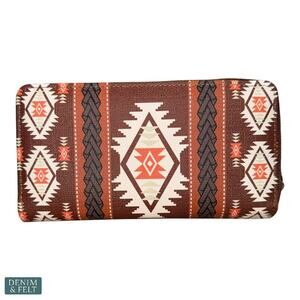 Tribal Print Brown Wallet Wristlet w/ Double Zip Around Closure & Card Slots NEW