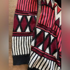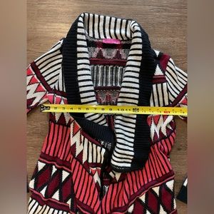 Casual fall cardigan, sweater, cover-up, shrug, shawl, pattern, tribal, print, red white, black, burgundy, maroon, geometric, comfortable, cozy