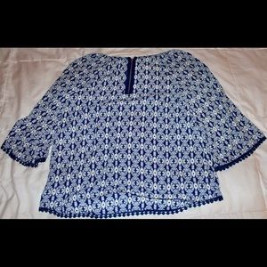 Navy blue and white tribal print quarter-sleeve top, sheer, 3/4 zipper back, detailed trim