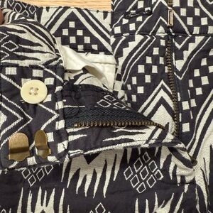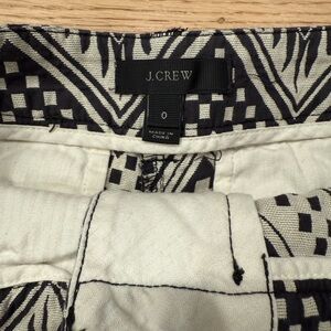 Like new J Crew shorts in a black and cream colored tribal print. Slant pockets and a hook and button enclosure.