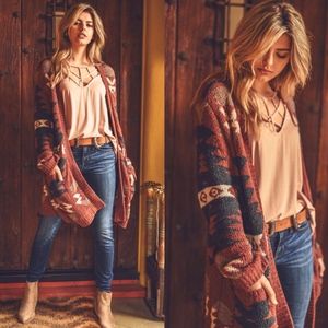 Tribal print soft plush cardigan with long sleeves and front pockets.