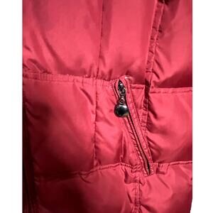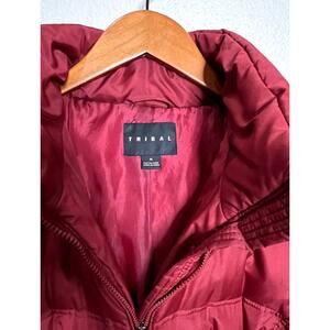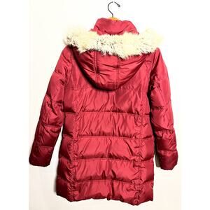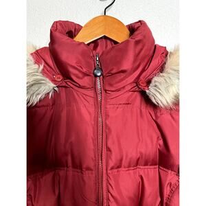 Tribal Puffer Coat with detachable Faux fur lined hood, red zip-front size M