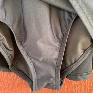 one-piece swimsuit featuring wrap-front design, v-neckline, and classic silhouette