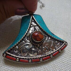 Tribal TURQUOISE & RED CORAL Handmade Sterling Silver Pendant on a 18" Black Leather Cord (2 1/4" x 2 1/2") #238C