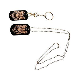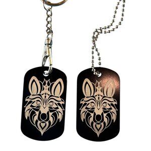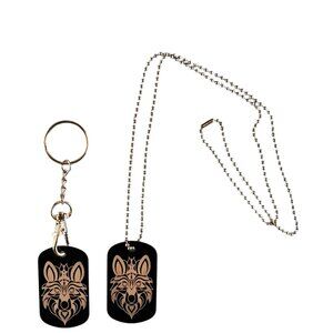 Tribal Wolf Dog Tag Necklace and Keychain Set, Black Metal with Gold Design, Bal