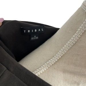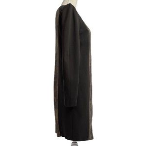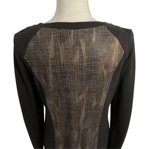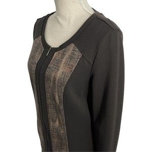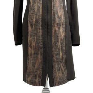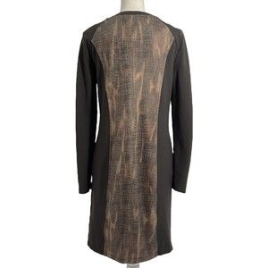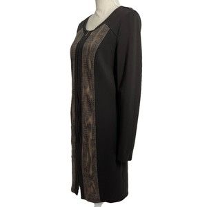 Tribal Womens Long Sleeve Full Front Zip Mixed Media Sheath Dress Size 8. Golden Bronze Metallic Abstract Snake print design down middle of the front and back with solid brown on the sides and sleeves.