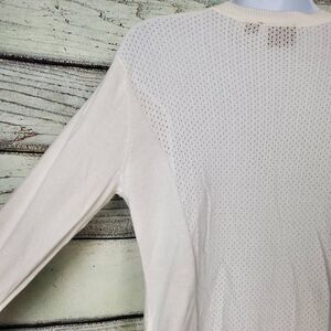 Tribal women’s cardigan sweater in white. Features V-neckline, button front closure, open knit design on sides and sleeves, lightweight cotton blend. Women’s size Small.