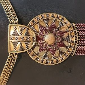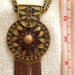 The tribal necklace is gold and bronze toned and has a beautifully detailed pendant with metal tassels. The necklace is 15 inches long w a 2 inch extender and the tassels hang down another 8 inches. You will make quite a statement in this necklace.
