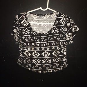 Black crop top with white tribal print graphics. It has only been worn once, but it does fit comfortable.