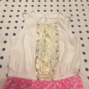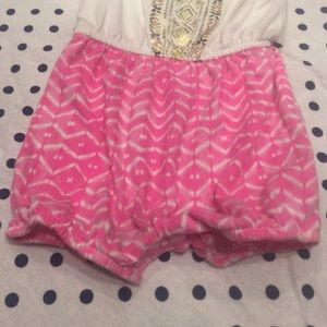 Cream colored knot top with gold foiled tribal print and pink bottom with three snap buttons for easy access. Comes from a non-smoking and non-pet home.