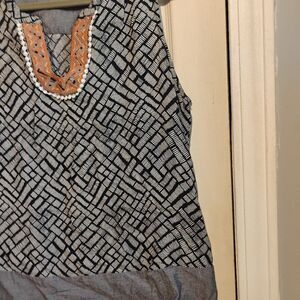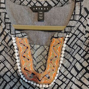 This Tribal tank top showcases a bold black and white graphic design, enhanced by a unique bib collar. The sleeveless style is perfect for warm weather, offering a lightweight and comfortable fit. Embellished details add a touch of sophistication to this versatile top.