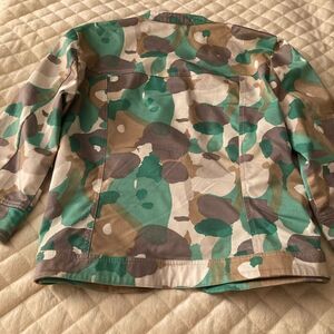 This jacket is so lightweight and fun. It is feminine camo-esque. The hardware is silver and isn’t heavy at all. Check out the breast pocket . The cropped hem is very slimming.