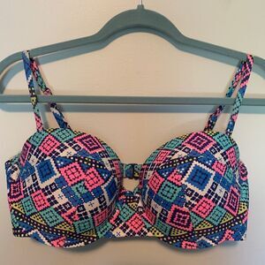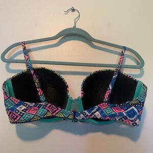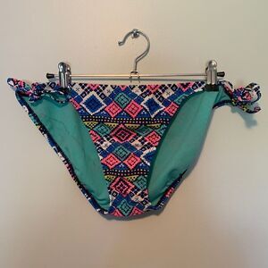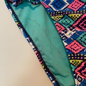 2 piece bikini with full cups for the top and string tie bottoms. Blue green and pink print. L bottoms and XZl top. Old Navy brand. Great condition with dirt mark on the side. Can be washed out.