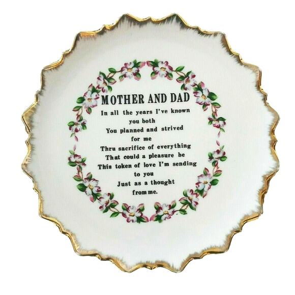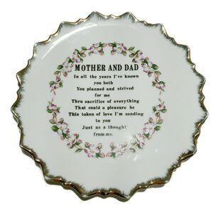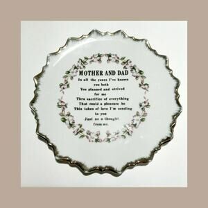 This beautiful vintage plate is a touching tribute to a beloved mother or father. The plate features a delicate floral design surrounding a heartfelt poem, making it a perfect gift or keepsake.