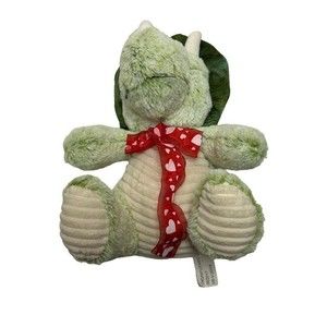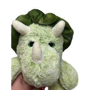 Very cute green triceratops stuffed animal. This cutie has a green ruff and white horns. The eyes are green glitter and acrylic. There is a red and white ribbon around his neck. There is a bit of red under the ribbon that has bled off the ribbon but the dinosaur is very clean. The cutie measures 13"