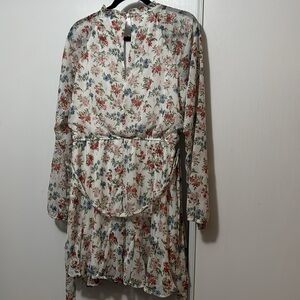 Chic floral dress with long sleeves. Features a mix of red, blue, and green flowers on a white background. Has waistband all around waist in perfect condition