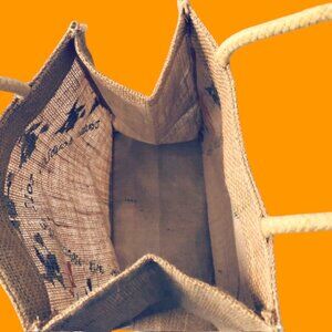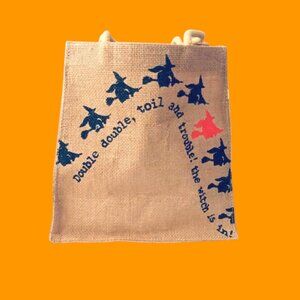 This is a burlap bag with witches flying across with the front & back. Message “ Double double, toil and trouble!” It is reusable and strong to hold all your goodies. 10” x 10” x 6”. Thee handles are 7.5” long.
