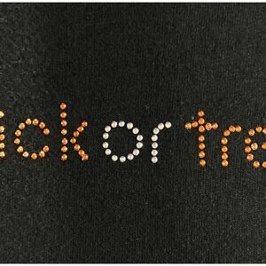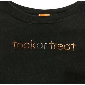 Women's bedazzled Halloween t-shirt with "trick or treat" in tiny orange and white gems across the chest. No brand label. Pullover short sleeve crew neck. Due to light & screen variations, colors may vary slightly from the images
