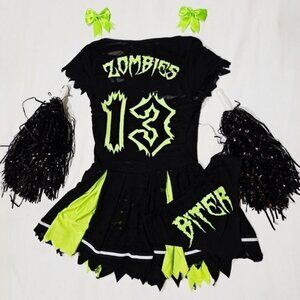 Zombie cheerleader costume, Trickz N Treatz cosplay, undead pep squad, neon gothcore, alt‑core Halloween, distressed pleated dress, raw hem mini dress, spooky spirit wear, XS NWT