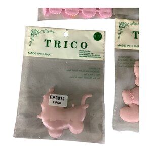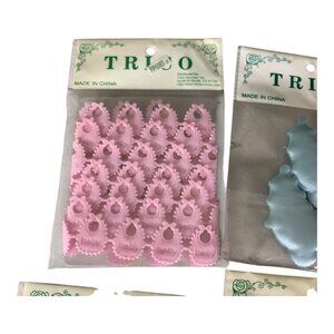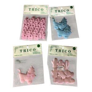 Four packages of Trico craft embellishments featuring baby themed designs, including mittens, rattles, and animals. Perfect for crafting projects and decoration. Pink and blue sets included.