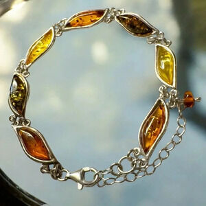 Genuine Baltic Amber Sterling Silver Bracelet Featuring Honey Amber, Green Amber and Cognac Amber.