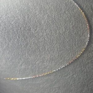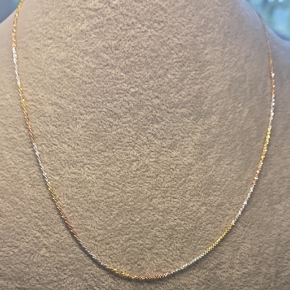 This elegant necklace features a stunning blend of rose gold, yellow gold and silver tones, perfect for any occasion by itself or with a lovely pendant. Its sleek design adds a touch of sophistication and individuality to your look. .925 sterling silver with rose gold and yellow gold overlay.