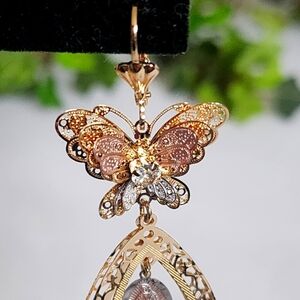 Tricolor Gold Drop Filigree Earrings Butterfly with Virgin Mary
