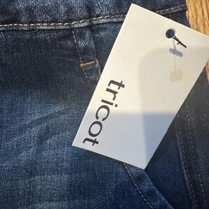 Keywords: denim midi skirt, button front skirt, pockets, frayed hem, overalls skirt, blue denim, casual skirt, midi skirt, Tricot, skirt, jean skirt, womens skirt