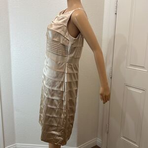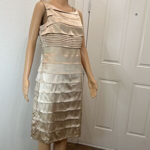Tricot Silk Dress Gold Scoop Neck Sleeveless Layered Slimming Midi Pearl Buttons