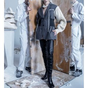This is such a good sweater blazer. It’s a perfectly stylish way to usher in fall. Made of Wool thread. Notched lapel collar. Sleeves with structured 100%wool. Perfect fusion between the classic blazer and a tricot blazer. The blazer hugs the waist with a ribbed fabric on each side. Welt pocket at chest. The detailed thread give a deconstructed look. Lining made of viscose. Front button closure.