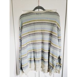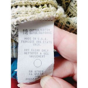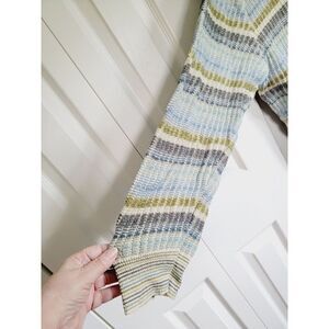This Tricots St. Raphael sweater is a classic '90s pullover with a crew neck and cable-knit striped pattern. Made of a comfortable cotton/rayon blend knit fabric, this collarless sweater is in neutral multicolors and fits regular. It is a vintage piece, made in the United States, and is perfect for any occasion or activity. The sweater is sized L and is suitable for regular size men.