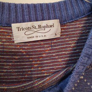 This stylish Tricots St. Raphael sweater is perfect for staying warm and fashionable. Crafted from 100% cotton, it offers comfort and breathability. The periwinkle blue shade with an orange, white and yellow diamond shaped pattern adds a touch of elegance to any outfit. The sweater measures 28" in length from the top seam of the shoulder to the bottom hem and 23" from pit to pit. Please see all photographs as they are part of the description. Shipped with USPS Ground Mail.