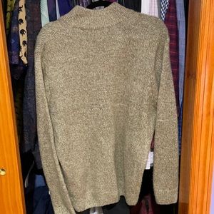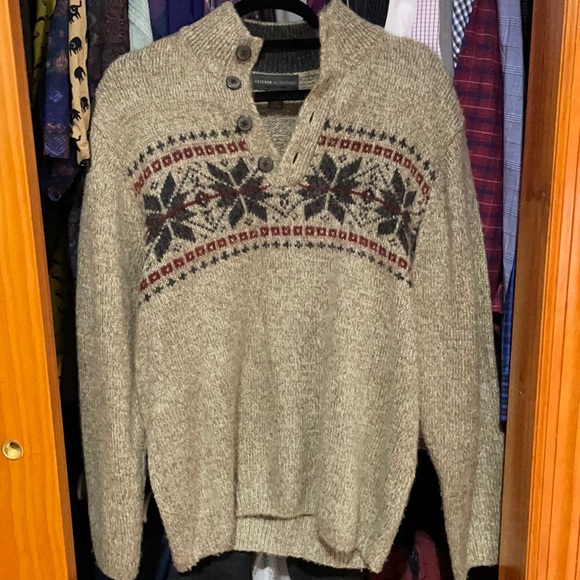 This is a very warm and cozy khaki color button up acrylic sweater with a winter snowflake design in dark grey and red. It’s true to it’s size and looks great on jeans, khakis, black or white trousers, and really any pair of neutral pants! Worn once ever!
