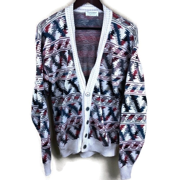 Tricots St. Raphael Women's Cardigan, Cream, Blue, and Red colors. Gently used condition. Tag has some writing on it as shown.