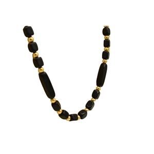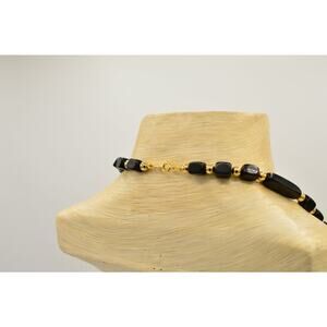 Trifari Black Beaded Necklace Statement Gold Geometric 32" Vintage Signed BinR