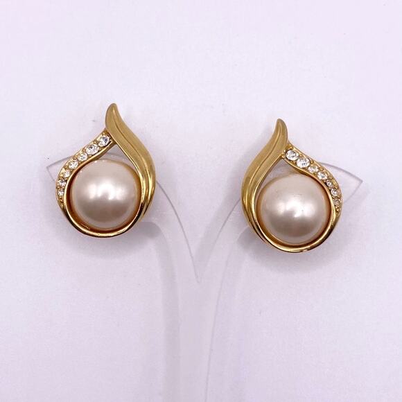 Trifari Clip On Earrings Faux Pearl Gold Tone