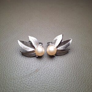 Trifari Clip On Earrings Silver Tone Leaf Faux Pearl Rhinestone Leaf Spray