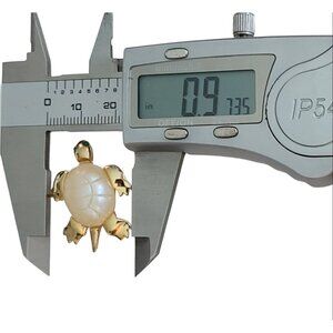 Trifari costume jewelry is an absolute favorite among jewelry lovers and collectors. This Trifari Gold Tone Plastic Pearl Shell Turtle Pin features a Turtle figural in gold tone with a plastic faux pearl oval piece that depicts the turtle's shell. It measures approximately 0.9 inches in width and 1.2 inches in length. Marked Trifari with a crown over T, and ends with a copyright symbol © on the reverse.Finished with a secure locking pin that functions properly and is in good vintage condition. This pin is a great gift for yourself, or for someone dear who loves to collect vintage costume jewelry.