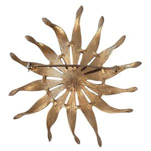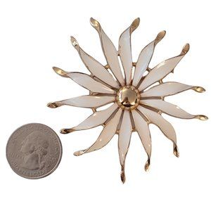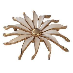 A stunning piece that showcases a delicate flower design, crafted with a lustrous gold-tone finish. The center of this flower is a radiant polished gold tone and the petals are gracefully formed with a twisted effect on each end. These petals are all intricately white enameled white which mimics the natural contours of the real flower and enhances this piece's visual appeal, infusing it with a warm and blooming aura. It measures approximately 2.7 inches in diameter. The back of this lovely pin is marked Trifari with a crown over T and ends with a copyright symbol ©. It features a secure pin closure on the back, making it easy to wear and fasten onto clothing. Please note that there's light white enamel chipping to this piece.